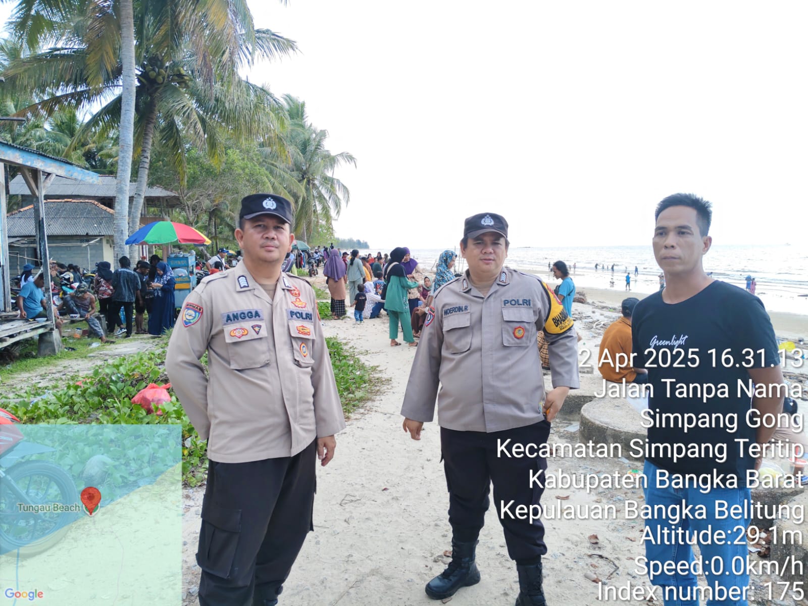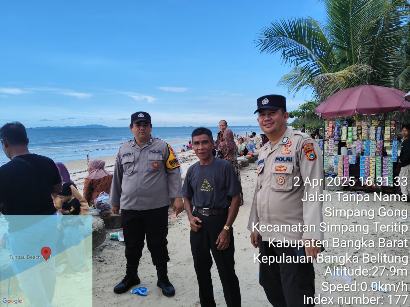 Bangka Barat,kejarberitanews.com-Menyambut libur lebaran, Polsek Simpang Teritip melakukan pengamanan dan patroli di Pantai Tungau, Desa Simpang Gong, Kecamatan Simpang Teritip, Kabupaten Bangka Barat. Kegiatan ini bertujuan untuk menciptakan situasi yang aman dan kondusif di lokasi wisata yang sering dikunjungi masyarakat selama liburan lebaran.2 April 2025.