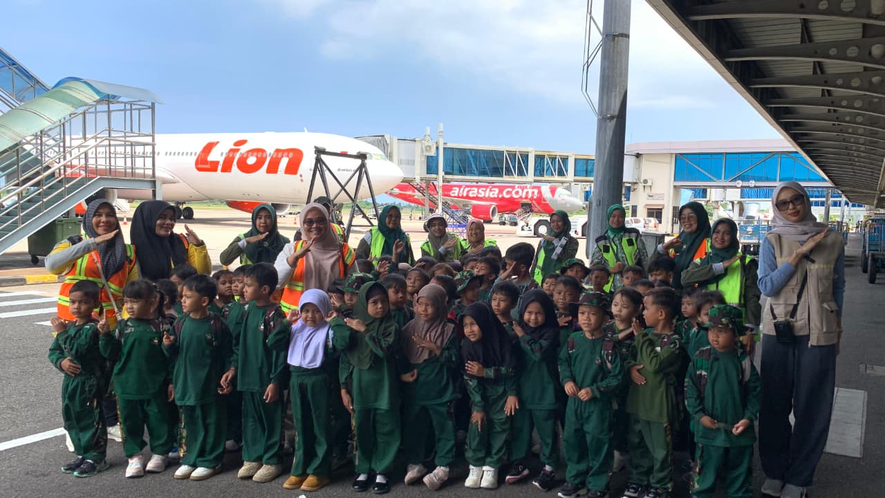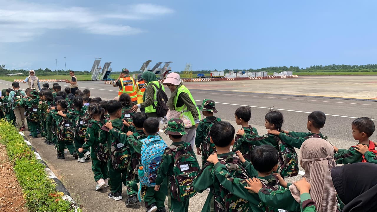 Tampak raut wajah gembira para anak usia dini ketika diberikan kesempatan masuk ke area landasan agar dapat menyaksikan secara dekat pesawat yang akan mendarat (Runway) dilandasan pacu.