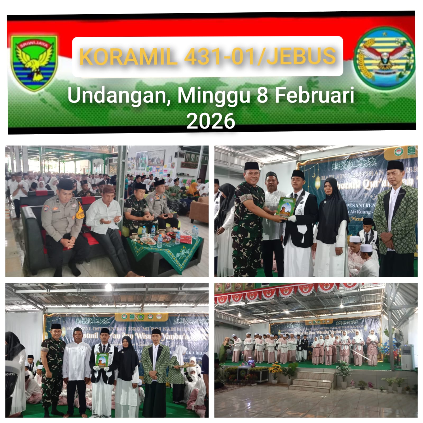 Jebus, kejarberita-news.com – Danramil 431-01/Jebus Kapten Inf Didik Suprayogi menghadiri undangan kegiatan Khotmil Qur’an dan Wisuda Yanbu’a ke-XII Pondok Pesantren Ta’limul Muta’alim LMY yang dilaksanakan bertempat di Desa Air Kuang, Kecamatan Jebus, Kabupaten Bangka Barat.pada hari Minggu, 8 Februari 2026