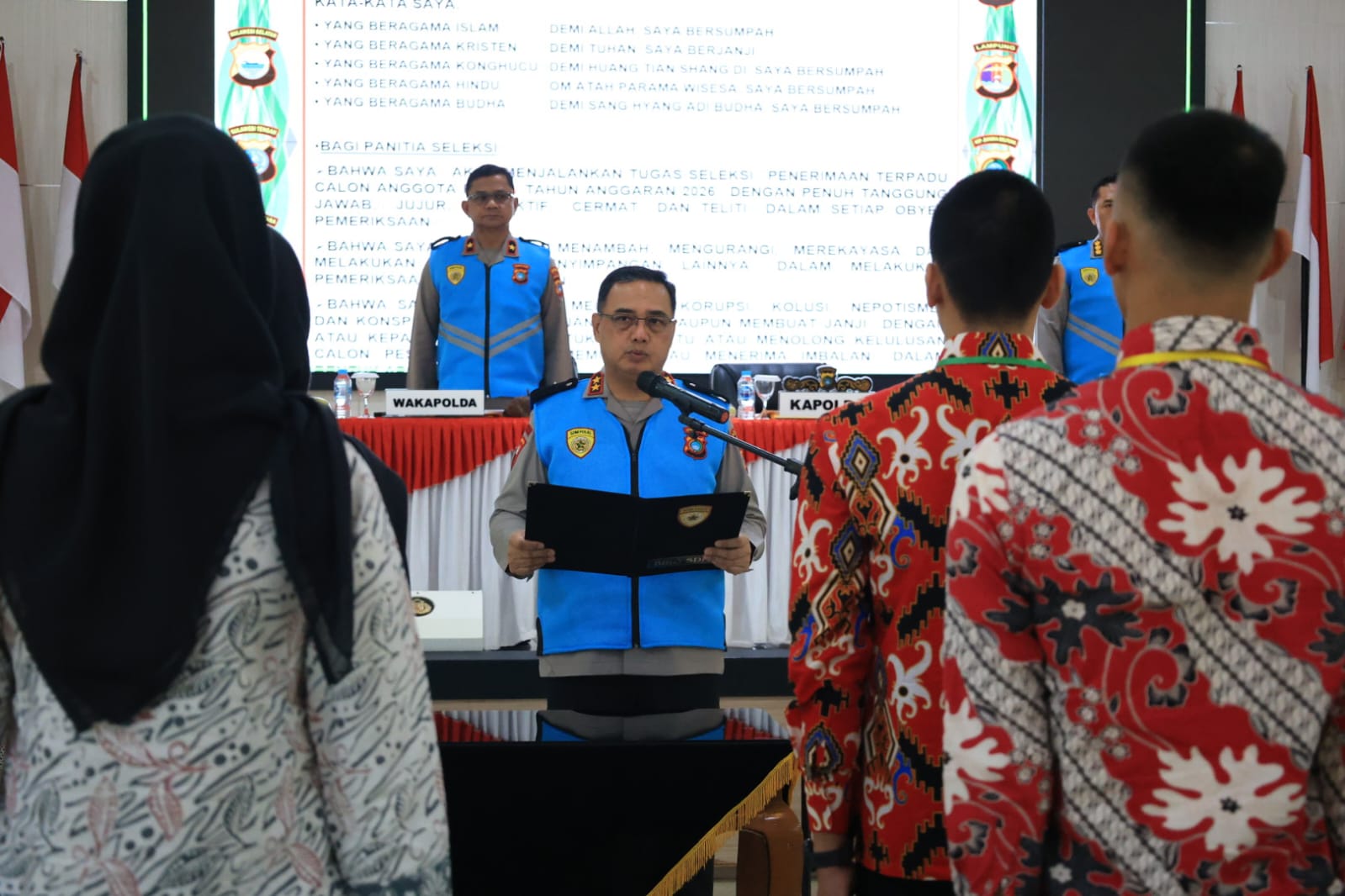 Selama seleksi berlangsung, Kapolda menekankan seluruh panitia agar dalam menjalankan janjinya untuk melaksanakan seleksi dengan selektif, transparan dan tanpa adanya upaya Korupsi, Kolusi dan Nepotisme (KKN).