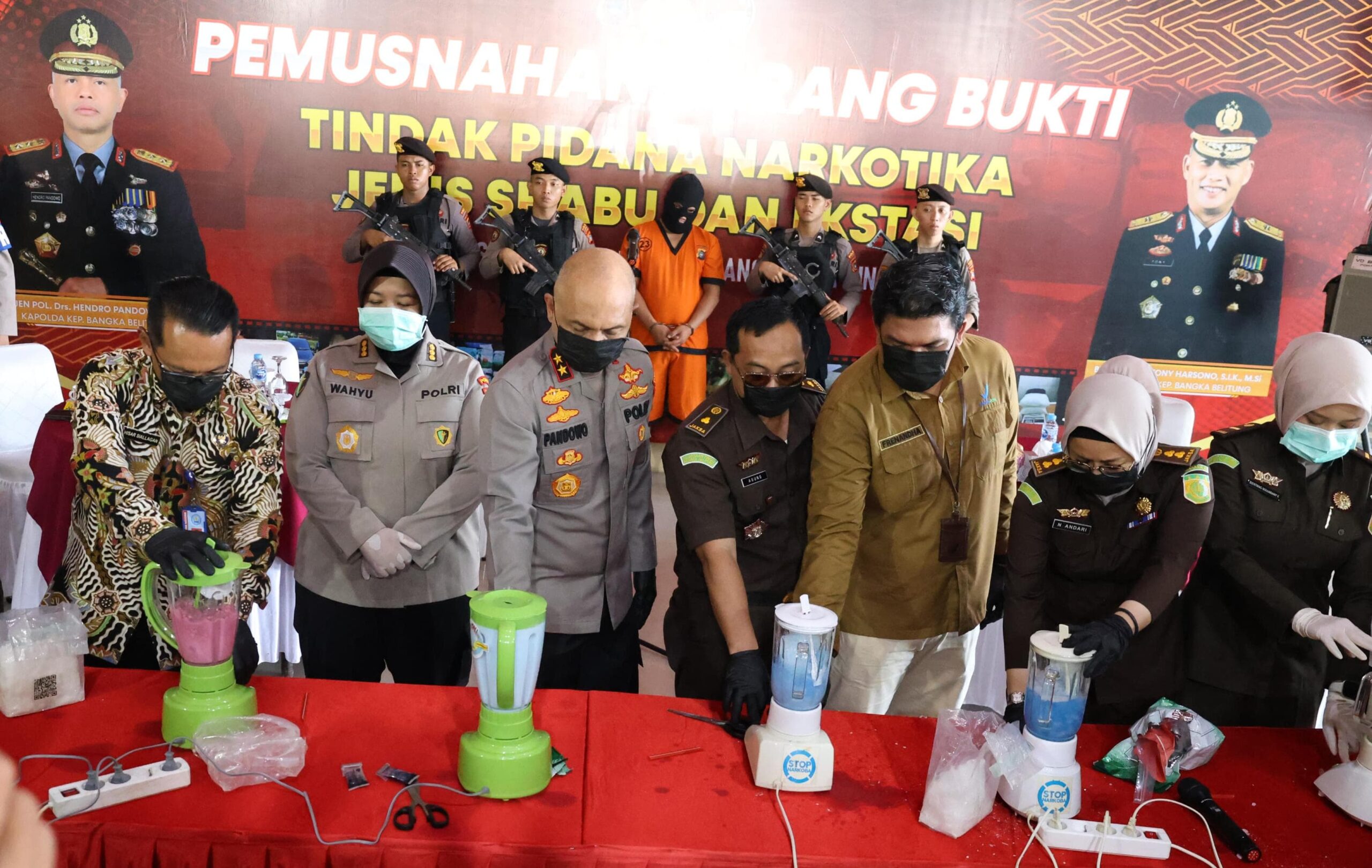 Sementara itu, dalam pemusnahan tersebut, barang bukti narkoba baik sabu dan pil ekstasi dihancurkan dengan cara dimasukkan kedalam blender yang telah dicampur air dan zat kimia.