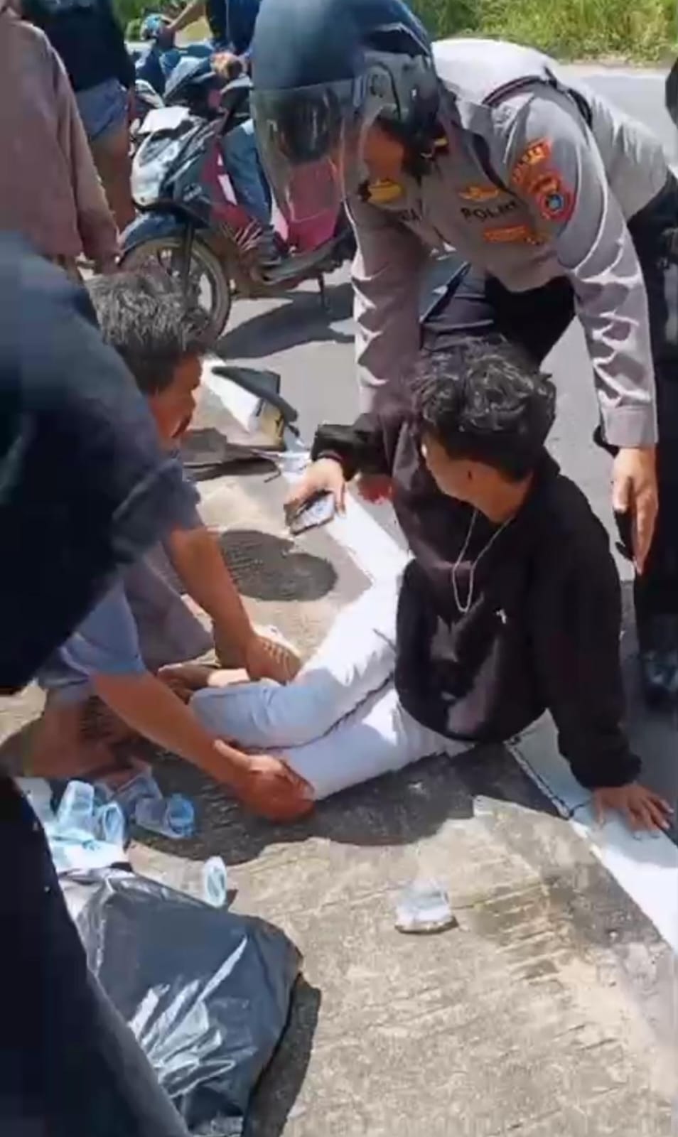 Melihat adanya kecelakaan, anggota kepolisian segera menghentikan patroli dan memprioritaskan penyelamatan korban. Polisi memberikan pertolongan awal, menenangkan korban, serta memastikan kondisi korban aman sambil menunggu bantuan medis.