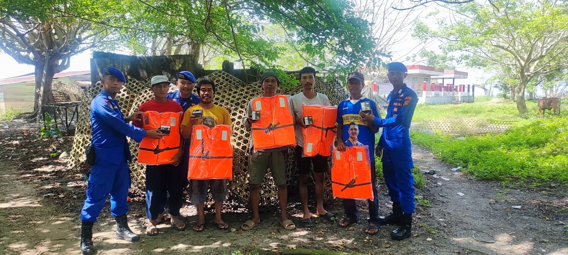 Sebagai bentuk dukungan nyata, polisi membagikan 5 jaket pelampung dan 5 senter kepada para nelayan sebagai sarana keselamatan saat melaut.