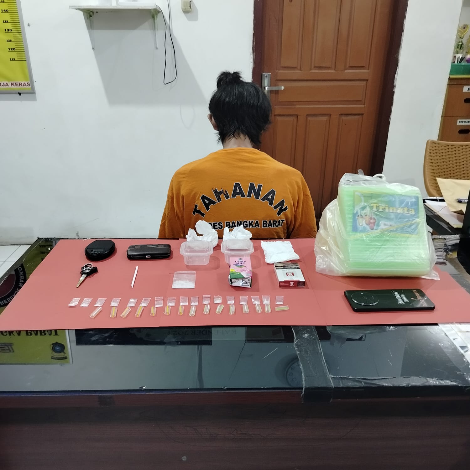 Adapun barang bukti yang diamankan dari tangan pelaku antara lain 18 paket plastik klip bening berisikan kristal bening diduga narkotika jenis shabu dengan berat bruto 5,92 gram, 15 potongan pipet plastik, satu unit timbangan digital bertuliskan Contan warna hitam, satu unit handphone Android merk Realme A3 warna hitam, dua buah wadah segi empat warna putih bening, satu dompet kecil warna coklat bermotif kotak-kotak, dua sekop kecil yang terbuat dari sedotan, tiga lembar tisu warna putih, satu bungkusan besar plastik asoi putih berisikan sedotan pipet plastik, satu kotak bekas susu Ultramil warna merah jambu, satu kotak rokok kosong bertuliskan Sampoerna warna putih, dan satu unit sepeda motor Yamaha Xeon warna putih list merah dengan nomor polisi BN 4573 RT.
