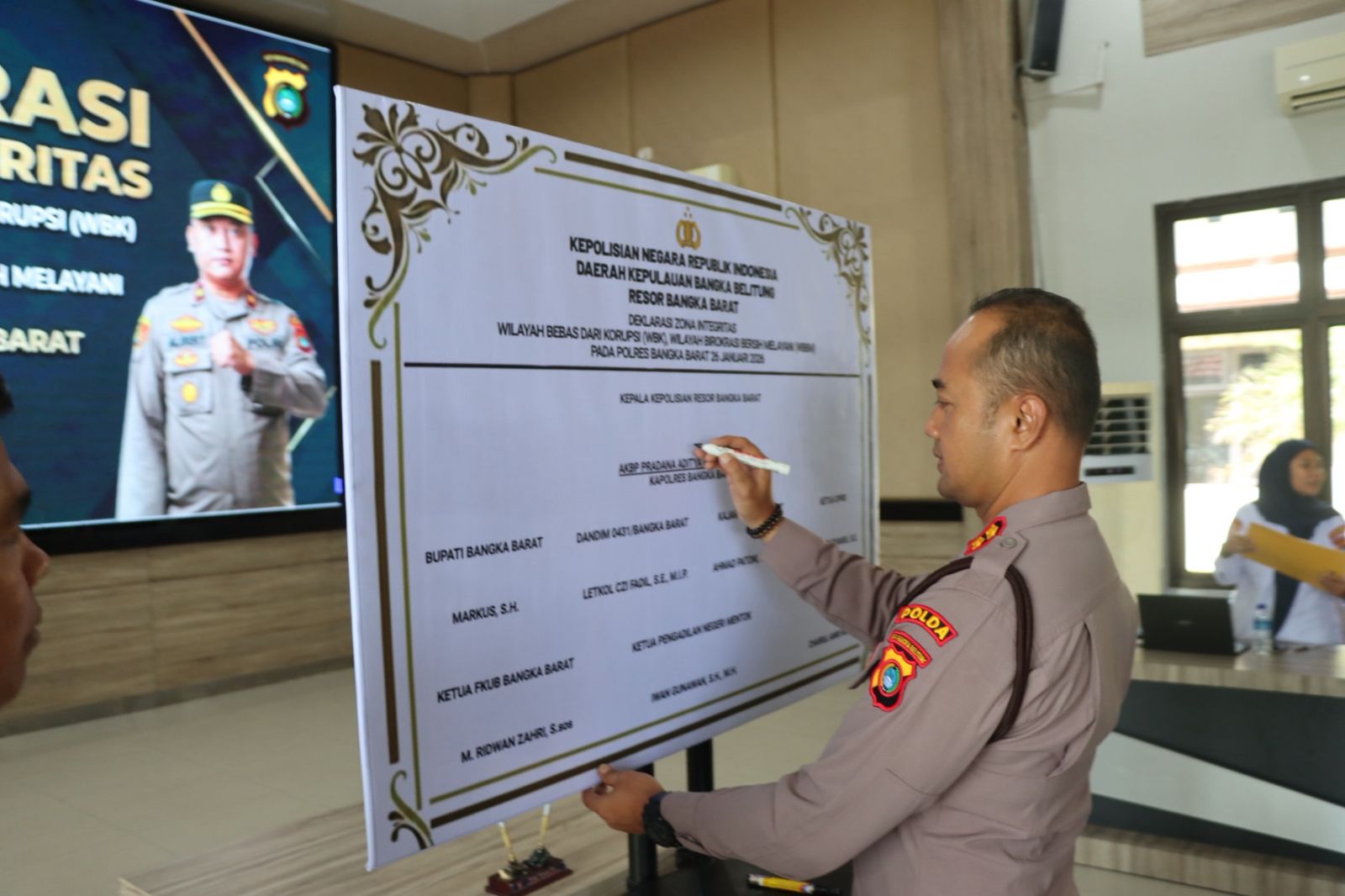 Deklarasi Zona Integritas ini juga ditandai dengan penandatanganan Fakta Integritas oleh unsur Forkopimda dan pejabat utama Polres Bangka Barat sebagai bentuk komitmen bersama dalam mendukung Polres Bangka Barat menuju WBK dan WBBM.