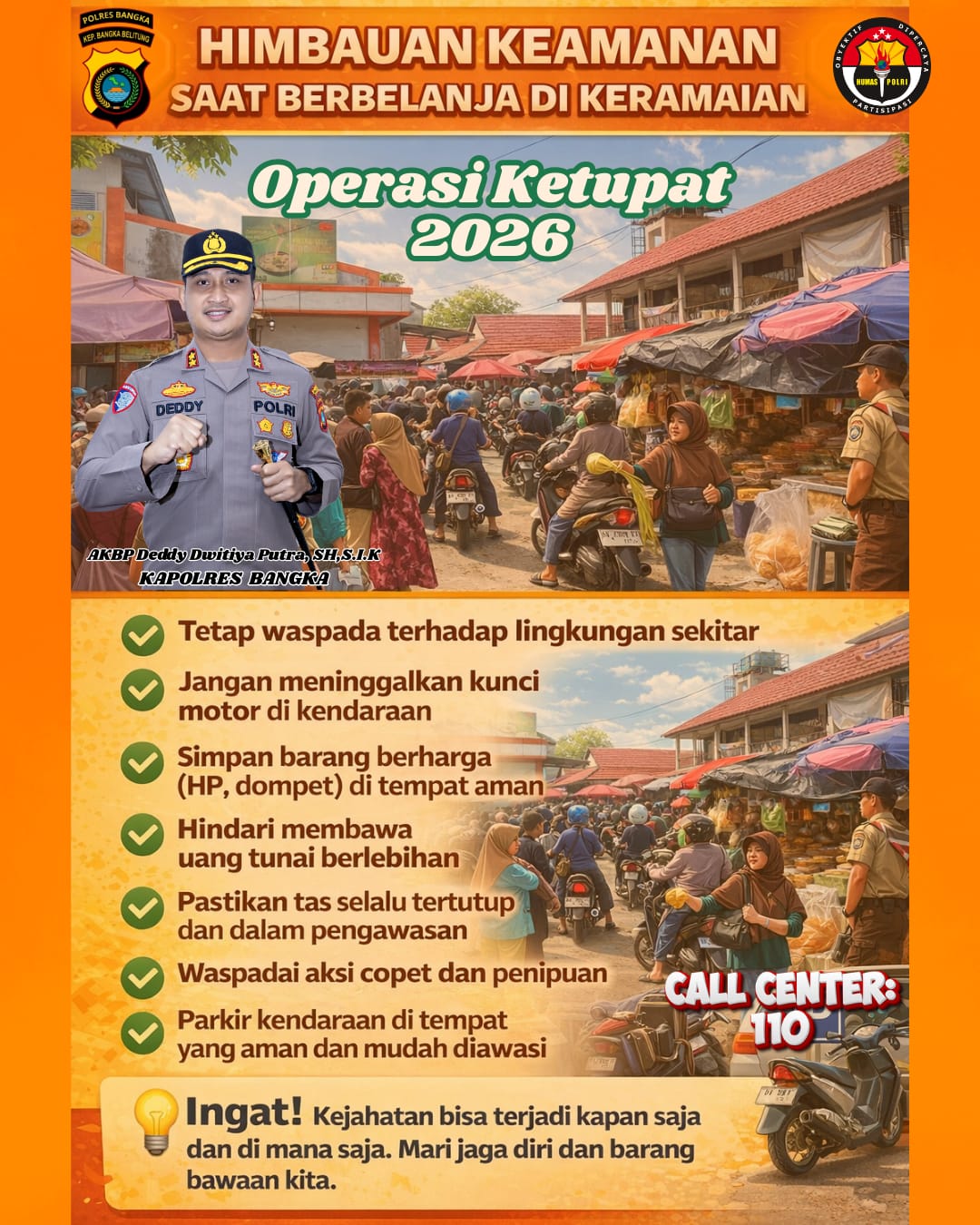 Kapolres Bangka, AKBP Deddy Dwitiya Putra, menegaskan bahwa potensi tindak kejahatan seperti pencopetan dan penipuan cenderung meningkat di tengah padatnya aktivitas masyarakat. Oleh karena itu, warga diingatkan untuk selalu memperhatikan keamanan diri dan barang bawaan.