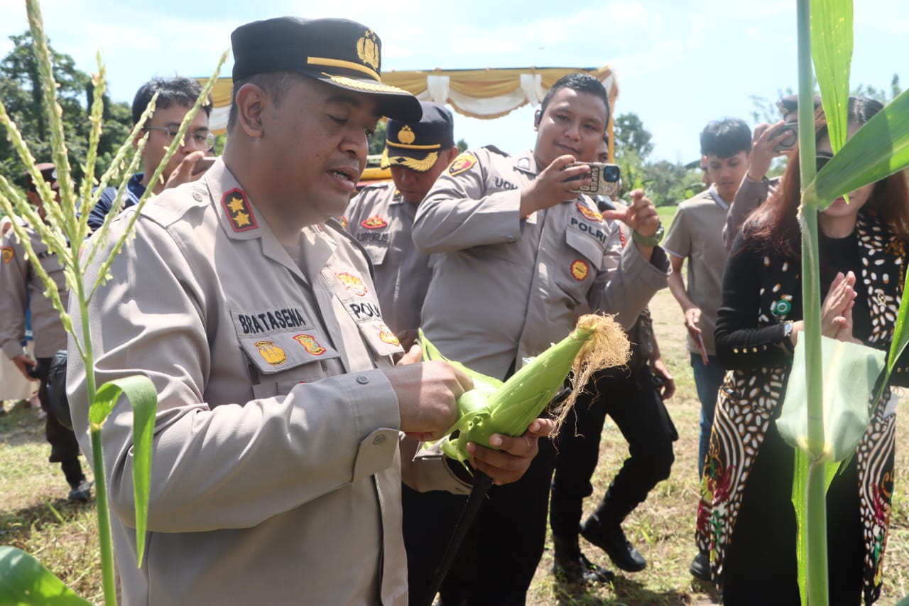 Acara panen raya berlangsung dengan semangat kebersamaan, ditandai dengan memetik jagung secara simbolis oleh para pejabat yang hadir, serta penyampaian arahan langsung dari Presiden RI melalui konferensi video kepada seluruh jajaran Polda/Polres se-Indonesia.