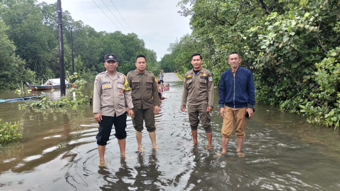 Personel Polsek Jebus Polres Bangka Barat bersama Bhabinkamtibmas, perangkat desa, TNI, dan relawan masyarakat melakukan pengecekan dan penanganan di sejumlah titik kritis: