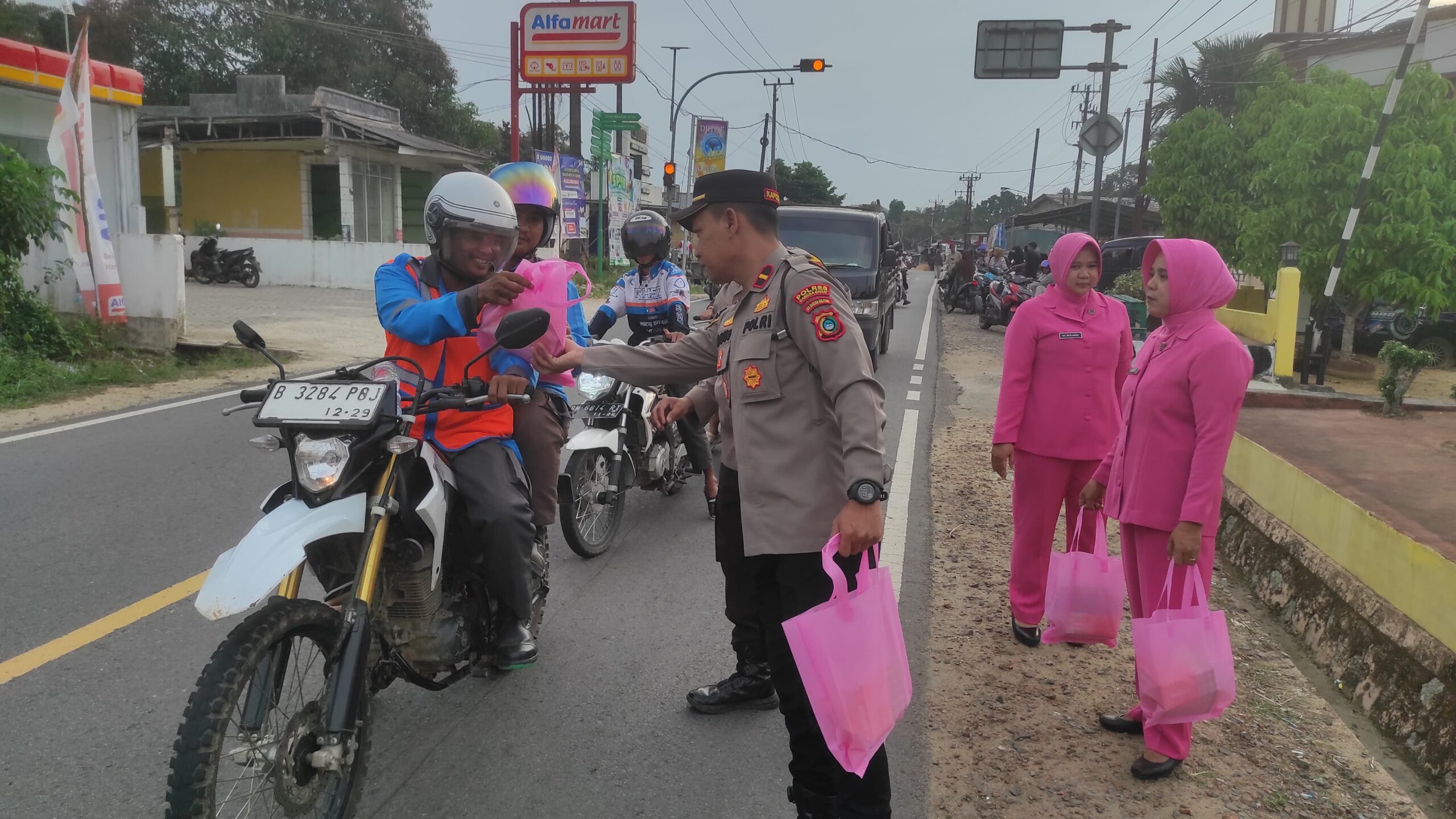 Pembagian dilakukan secara tertib di tepi jalan, sementara sebagian anggota lainnya membantu mengatur arus lalu lintas agar aktivitas masyarakat tetap lancar dan aman.