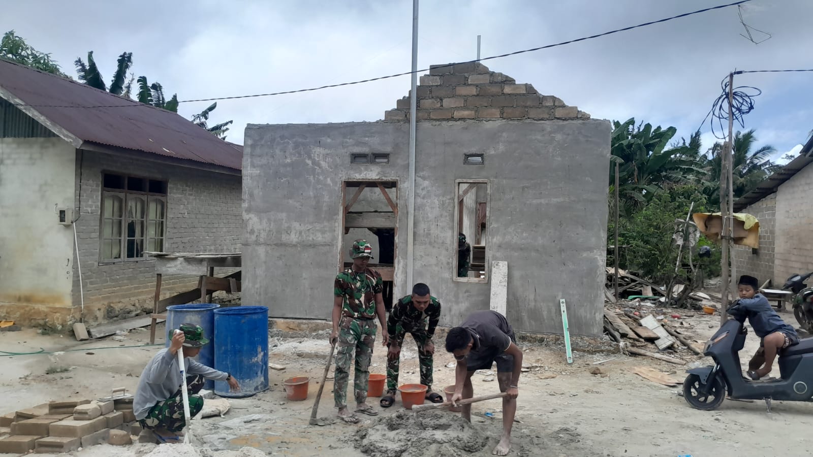 Semangat gotong royong tampak kental saat prajurit dan masyarakat bekerja sama mulai dari pemasangan pondasi hingga dinding bangunan.