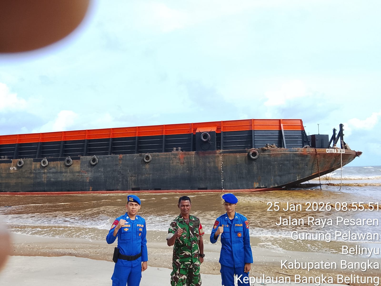 Belinyu, kejarberita-news.com – Menindaklanjuti laporan masyarakat, Babinsa Koramil 413-02/Belinyu, Serma Darwin, bergerak cepat melakukan pemantauan terhadap sebuah kapal tongkang yang terdampar di pesisir Pantai Dusun Beting, Desa Bintet, Kecamatan Belinyu, Minggu pagi (25/01/2026).