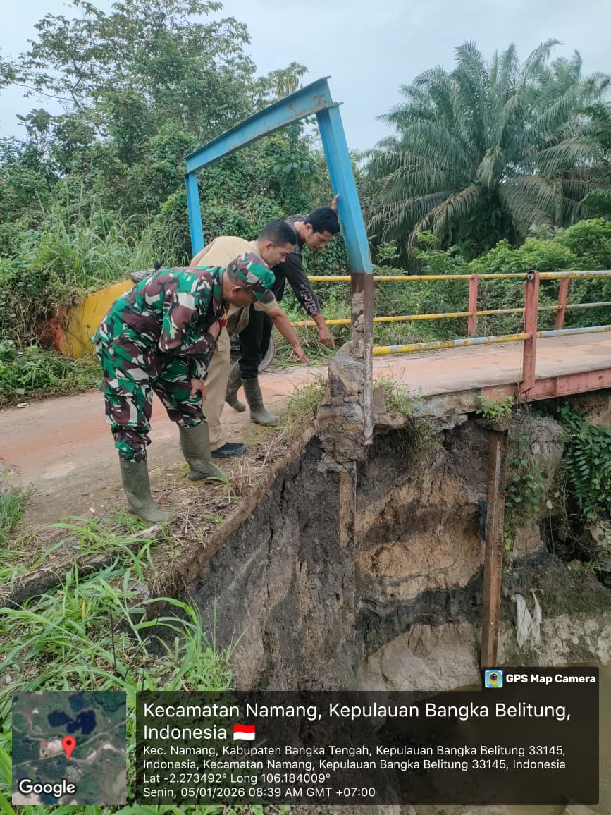 Bangka Tengah, kejarberita-news.com – Bertindak cepat menanggapi keresahan masyarakat, Babinsa Koramil 413-09/Pangkalan Baru, Sertu Feri Zaisal, melakukan pengecekan langsung terhadap kondisi jembatan di Jalan Laut, Desa Jelutung, Kecamatan Namang, yang nyaris ambruk, Senin (05/01/2026)