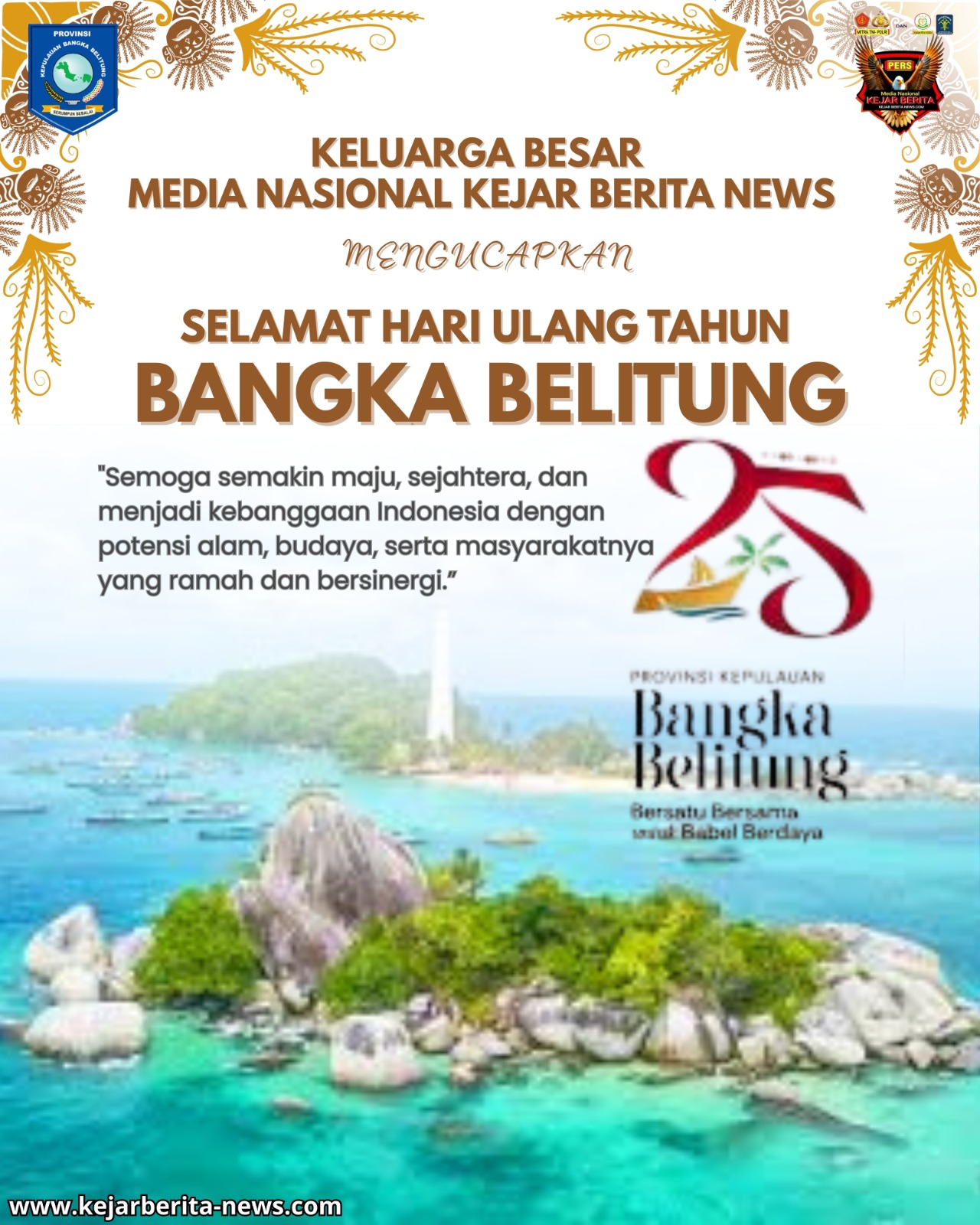 Pangkalpinang, kejarberita-news.com – Dalam Rangka Peringatan Hari Ulang Tahun Bangka Belitung yang ke-25 Tahun, Media Kejar Berita News sebagai portal media daring juga ikut serta dalam memeriahkan platform dengan serangkaian ucapan dan harapan yang di publis, dalam peringatan yang sekaligus menjadi momentum perayaan bahwa Provinsi Kepulauan Bangka Belitung sudah berdiri atas namanya sendiri dengan memasuki usia 25 Tahun.