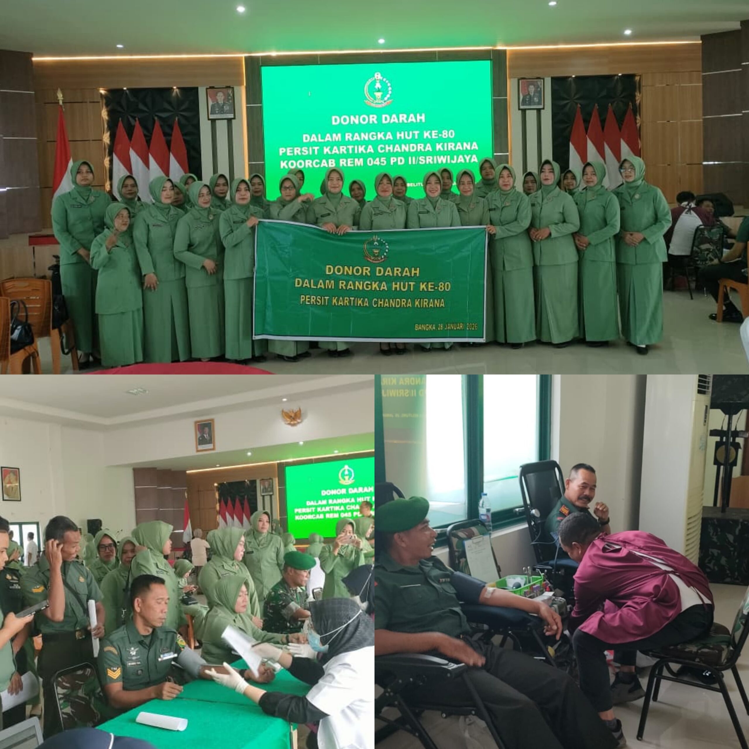 Pangkalpinang, kejarberita-news.com – Dalam rangka memperingati Hari Ulang Tahun ke-80 Persit Kartika Chandra Kirana, Kodim 0413/Bangka turut berpartisipasi dalam kegiatan bakti sosial donor darah bertempat Aula Makorem 045/Garuda Jaya, Rabu (28/01/2026).