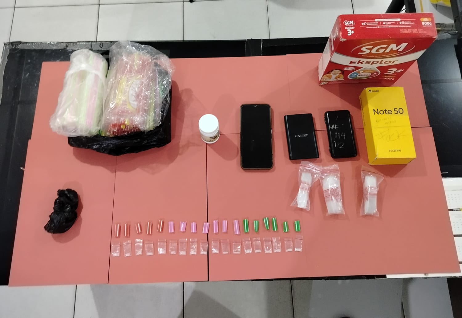 Dari penggeledahan yang dilakukan di Bagian Dalam rumah (RI), Anggota sat Resnarkoba berhasil menemukan 18 paket plastik klip bening yang berisikan butiran kristal bening diduga Narkotika jenis shabu dan 2 Timbangan digital warna hitam.