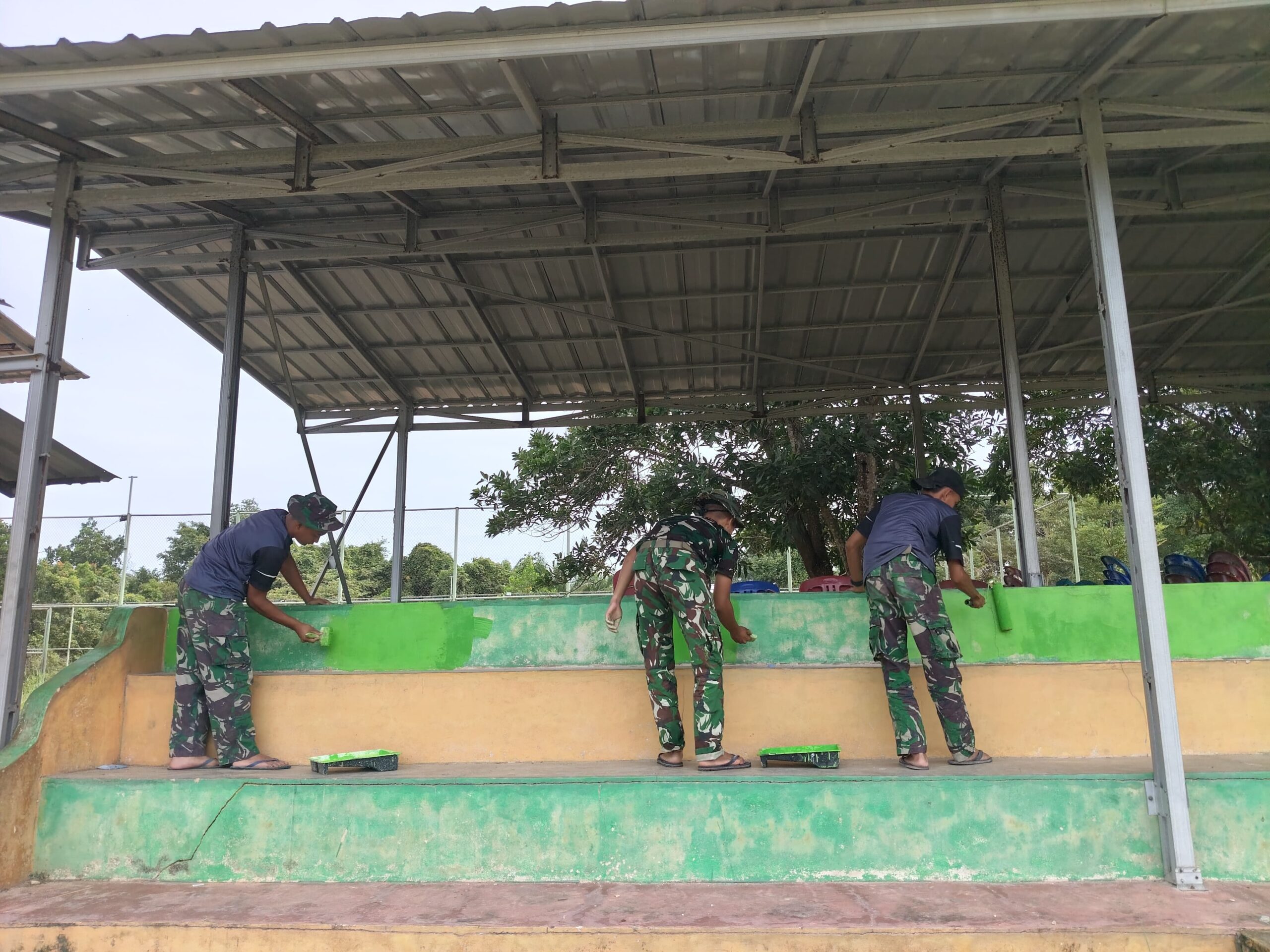 Selain pengecatan tiang gawang, Satgas juga melakukan pengecatan Bangku Tribun penonton, pemberian sarana Olahraga dan pembersihan area sekitar lapangan Bola agar lebih bersih dan aman digunakan.
