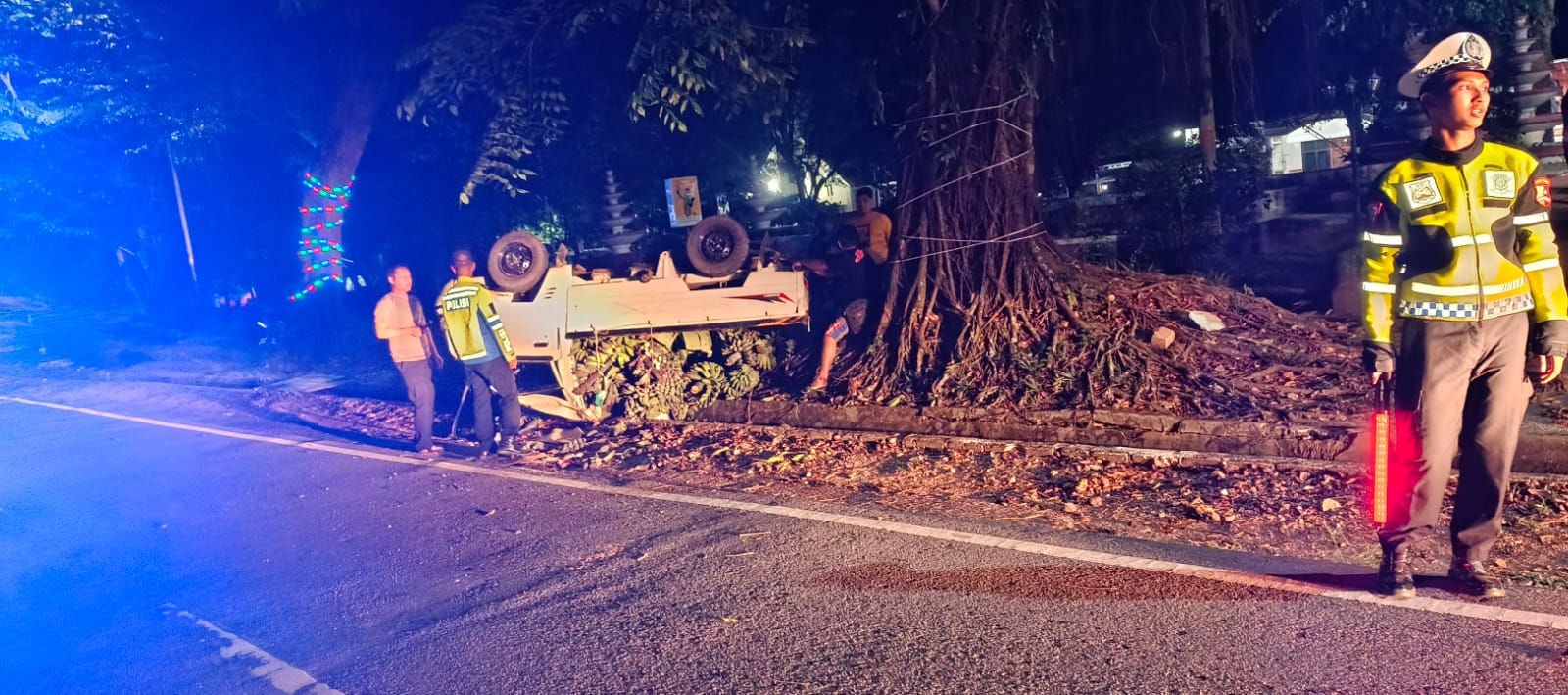 Diduga karena mengemudi dengan kecepatan tinggi dan dalam kondisi kelelahan, pengemudi tidak dapat mengendalikan laju kendaraan saat melalui tikungan tajam di depan Rumah Dinas Bupati. Akibatnya, ban kanan mobil masuk ke bahu jalan dan menyebabkan kendaraan terbalik.