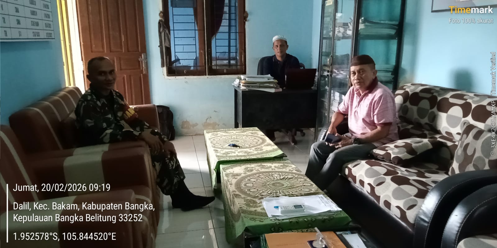 Dalil, kejarberitanews.com – Dalam rangka memperkuat sinergitas dan menjaga kondusivitas wilayah binaan, Babinsa Koramil 413-01/Sungailiat, Serka Suhartono, melaksanakan kegiatan Komsos bersama Aparatur Pemerintah Desa Dalil pada Jumat pagi (20/02/2026).