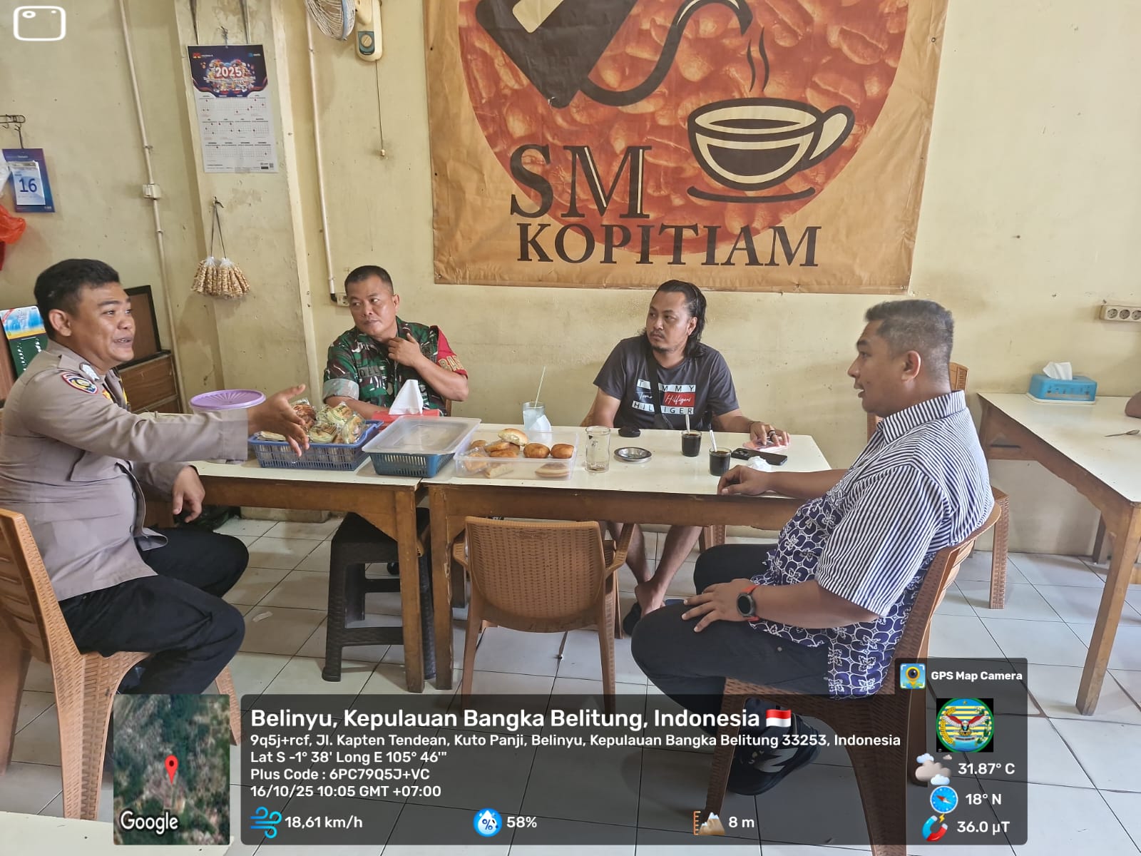 Di sebuah kedai kopi lokal, SM Kopitiam, yang terletak di area Jl. Kapten Tendean, Kuto Panji, Belinyu, babinsa dan bhabinkamtibmas sedang berdialog santai di meja bersama dua orang warga sipil.