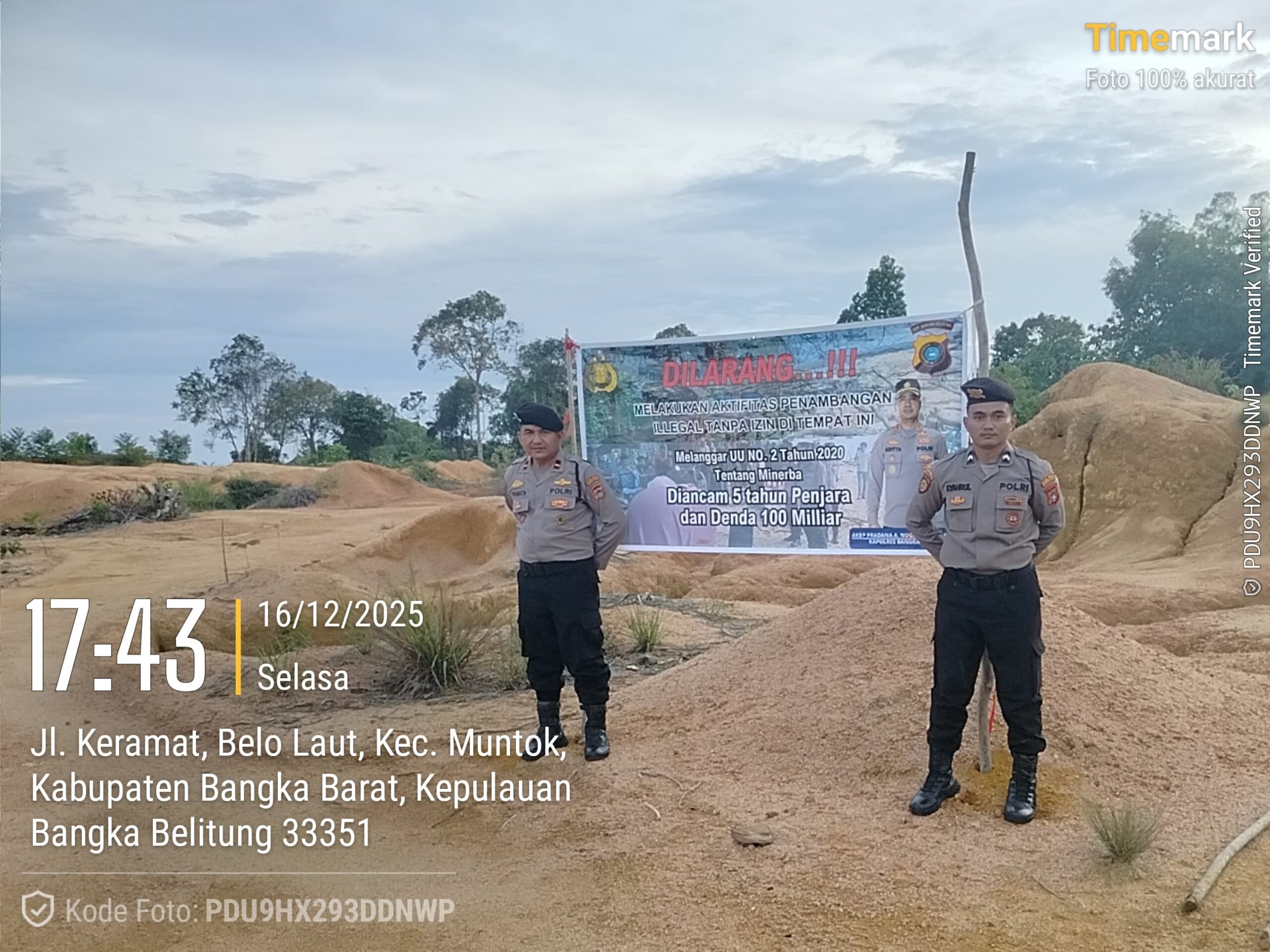 Bangka Barat, kejarberita-news.com – Dalam upaya mencegah kerusakan lingkungan serta menekan aktivitas penambangan ilegal, Satgas Preventif Polres Bangka Barat melaksanakan pemasangan spanduk imbauan dan larangan di sejumlah titik rawan tambang ilegal, Selasa (16/12/2025).