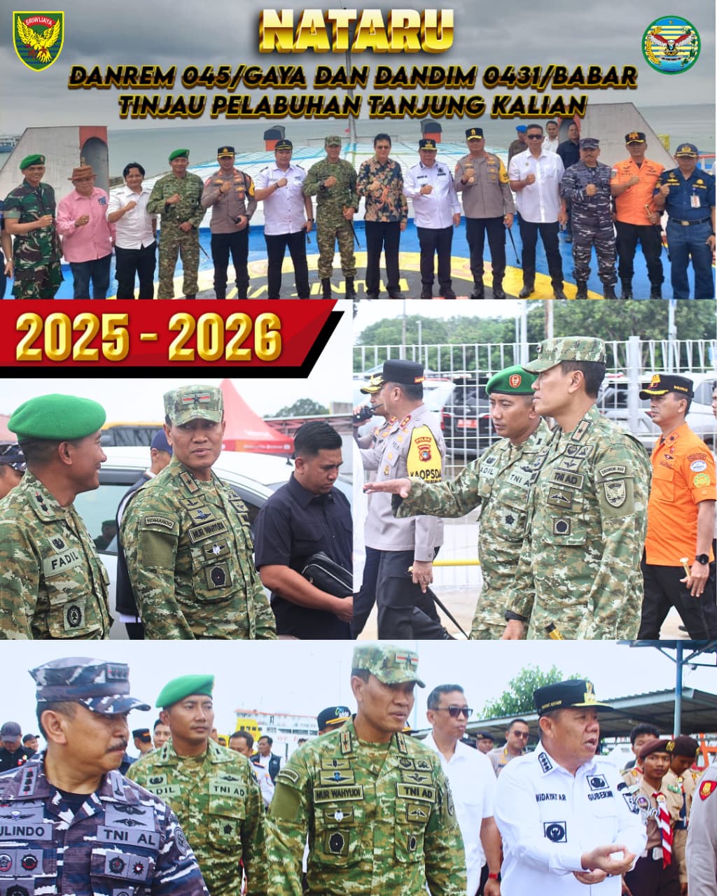 Bangka Barat, kejarberita-news.com – Komandan Korem 045/Garuda Jaya Brigjen TNI Nur Wahyudi, S.E., M.H., M.I.Pol, bersama Dandim 0431/Bangka Barat Letkol Czi Fadil, S.E.,M.I.P serta Forkopimda Babel dan Forkopimda Bangka Barat melaksanakan peninjauan di Pelabuhan Tanjung Kalian Muntok Bangka Barat, Jumat (26/12/2025).