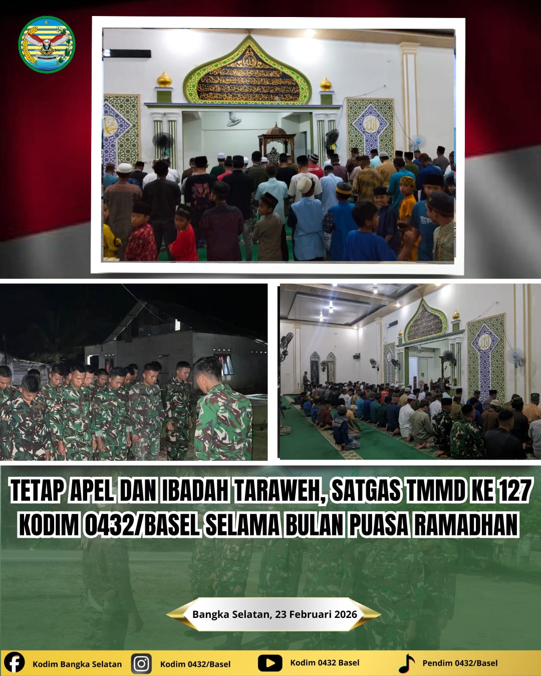Pulau Lepar Toboali, kejarberitanews.com – Dalam rangka menjaga kedisiplinan personel, Satuan Tugas TNI Manunggal Membangun Desa (TMMD) ke- 127 Kodim 0432/Basel Selama Bulan Suci Romadhan tetap rutin melaksanakan Apel apel sebelum memulai pengerjaan sasaran fisik dan malam Ibadah Solat berjamaah dengan Warga di lanjutkan Taraweh.