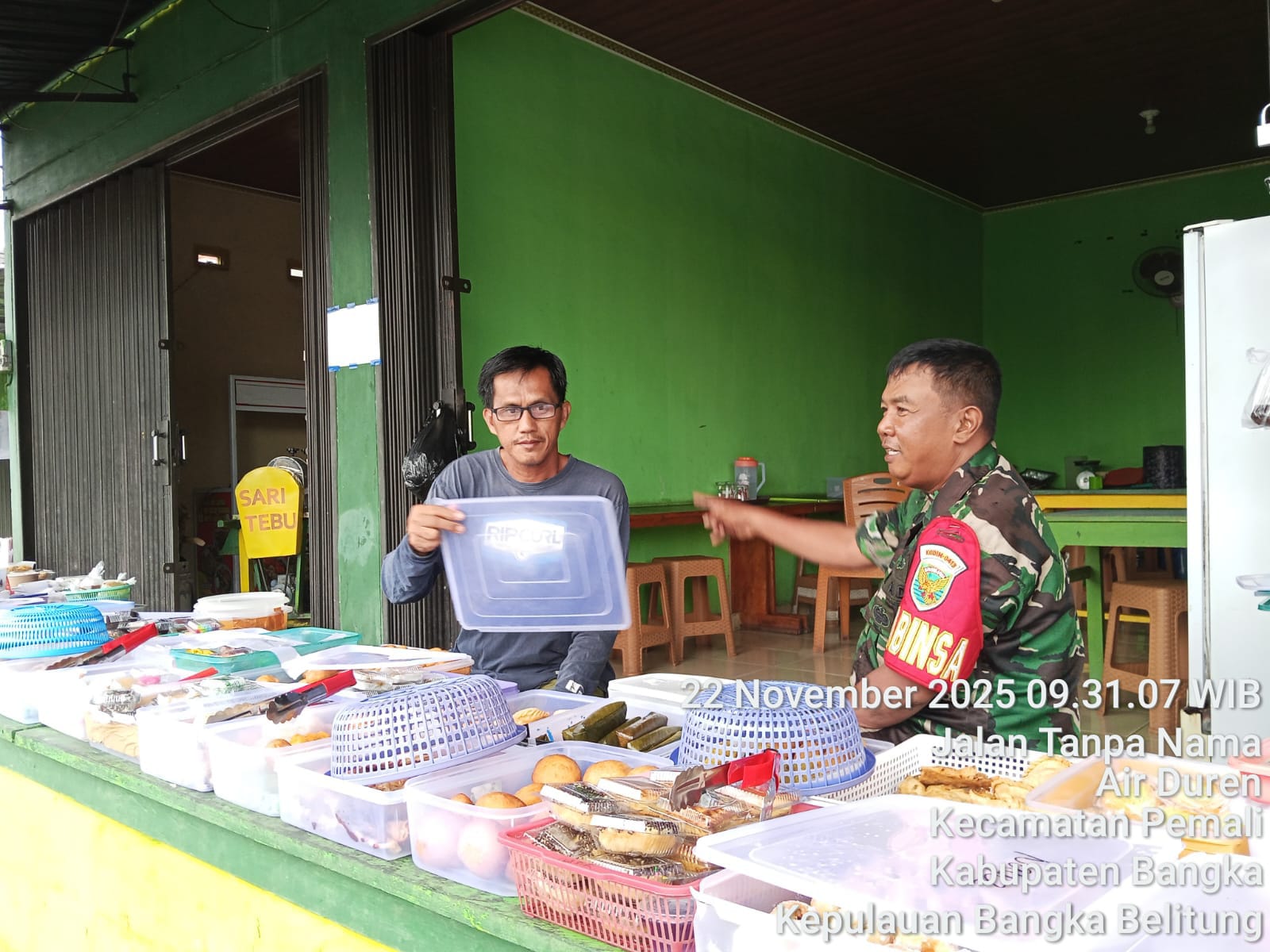 Warung Bapak Juki yang ramai dikunjungi pembeli kue basah dari Desa Air Duren maupun desa lain menjadi titik strategis bagi Babinsa untuk mendapatkan informasi terkini.
