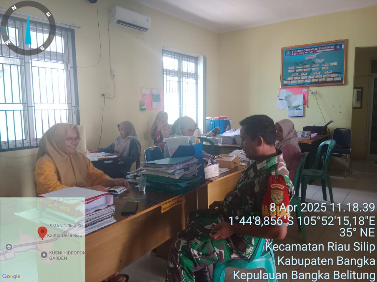 Belinyu,kejarberitanews.com-Tingkatkan Kerja Sama Yang Baik setelah lebaran, Babinsa koramil 413-02/Belinyu Komsos Bersama perangkat Desa riau silip, Selasa (08/04/2025)