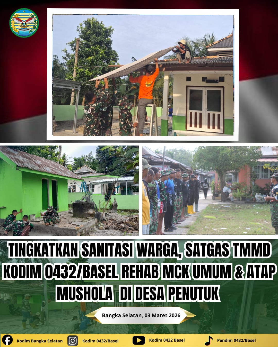 Pulau Lepar Toboali, kejarberita-news.com – Satgas TNI Manunggal Membangun Desa ke- 127 Kodim 0432/Basel terus mempercepat pengerjaan sasaran fisik. Salah satu fokus utamanya adalah rehabilitasi Mandi, Cuci, Kakus (MCK) umum dan Atap Teras Musolah Al Munawar yang berlokasi di Desa Penutuk Pulau Lepar Basel, sebagai upaya meningkatkan kualitas hidup dan kesehatan masyarakat pedesaan dan kenyamanan dalam beribadah.