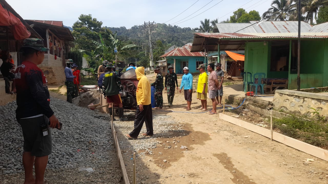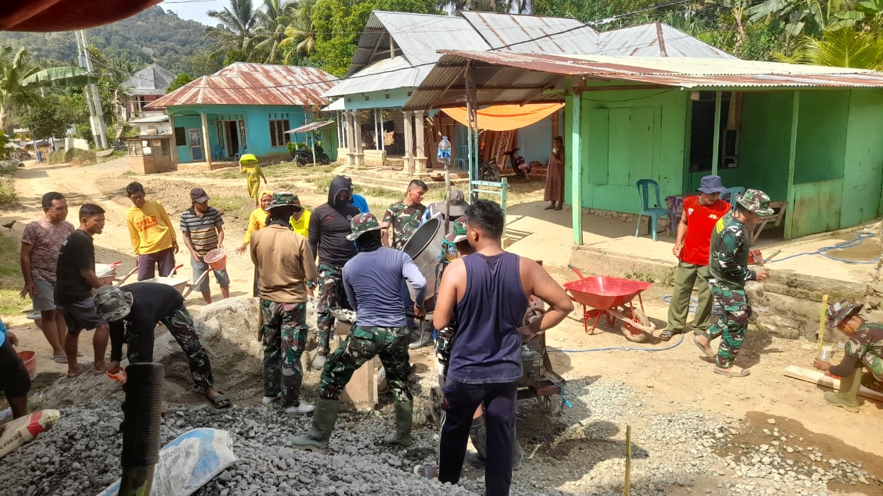 Sejak matahari baru menampakkan sinarnya, tampak prajurit TNI dan masyarakat setempat saling bergandengan tangan, mengangkat semen, mengaduk pasir, dan menata batu.