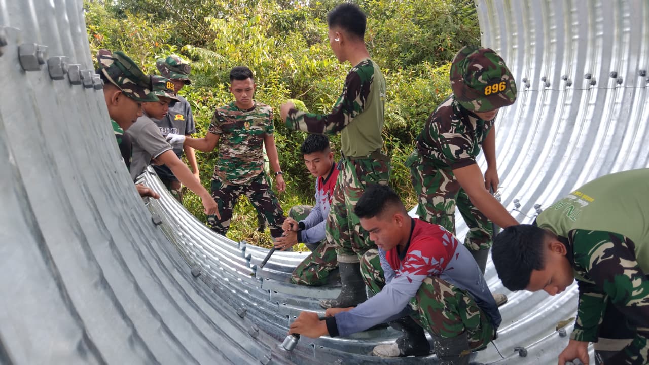 Adapun pekerjaan yang sedang dilaksanakan di lapangan saat ini meliputi perakitan gorong-gorong Armco serta perakitan besi untuk pondasi jembatan sebagai tahap awal pembangunan. Proses pengerjaan dilakukan secara gotong royong oleh para prajurit dengan penuh semangat meskipun berada di tengah aktivitas ibadah di bulan Ramadan.