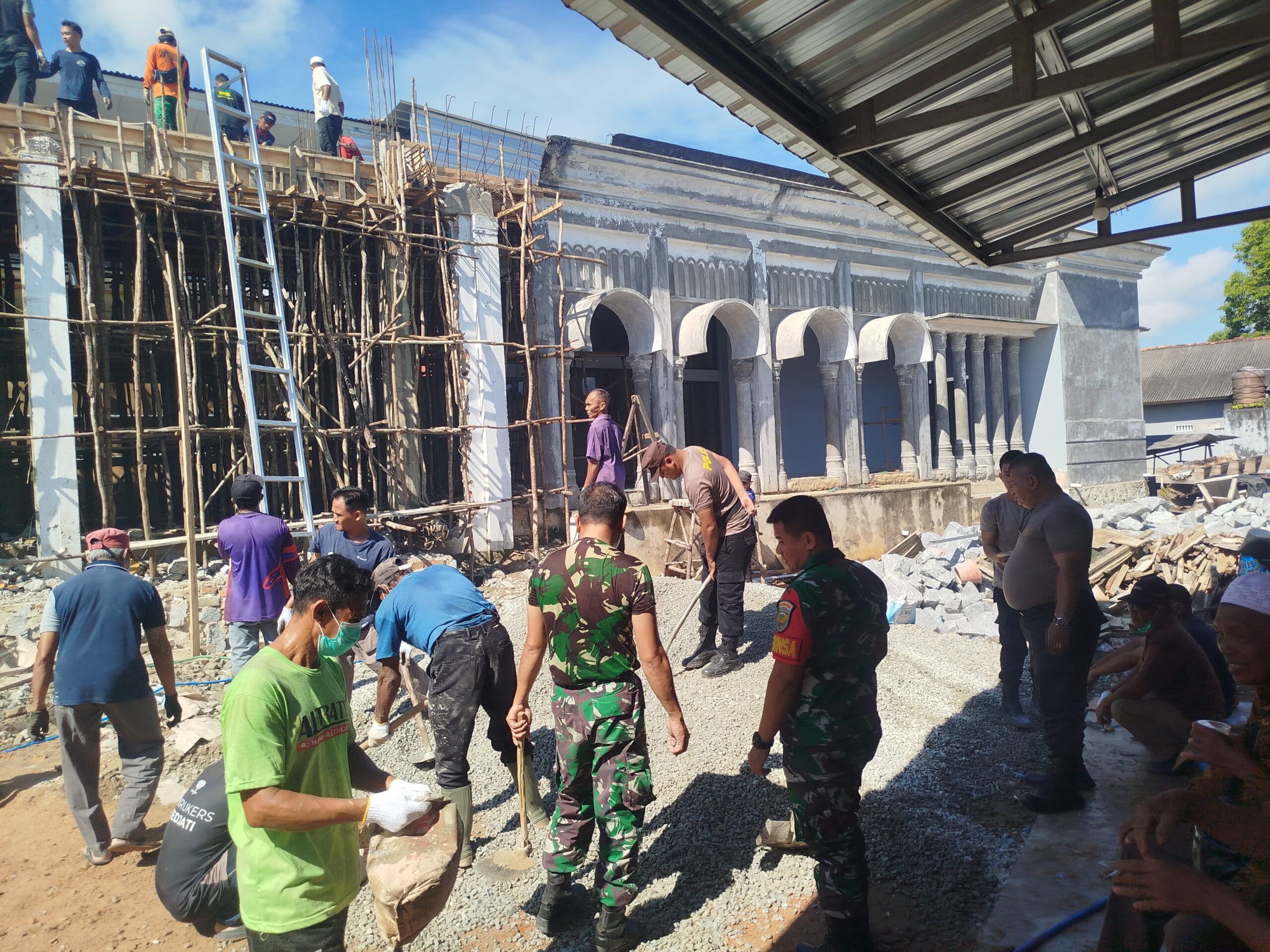 Kegiatan dimulai pukul 07.00 WIB dan berlangsung hingga selesai. Aparat bersama warga tampak bahu-membahu melakukan pengecatan, perbaikan bangunan, dan pembersihan area masjid.