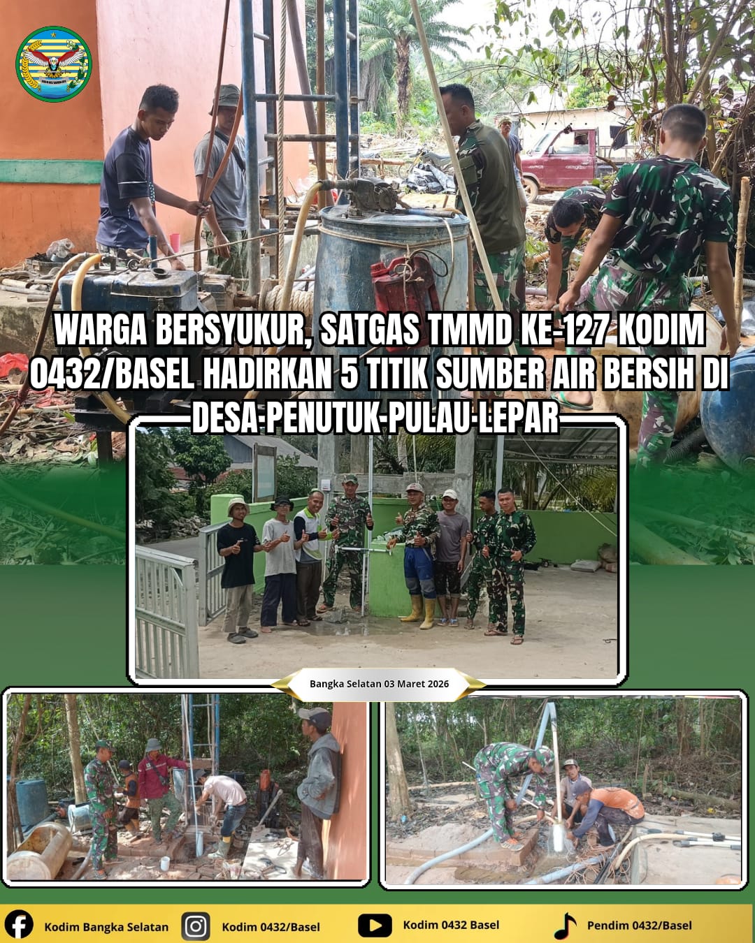 Pulau Lepar, kejarberita-news.com – Harapan warga akan ketersediaan air bersih terus dikejar tanpa lelah. Memasuki hari-hari terakhir pelaksanaan TNI Manunggal Membangun Desa (TMMD) ke-127 Tahun Anggaran 2026, jajaran Satgas TMMD Kodim 0432/Basel berhasil menyelesaikan program unggulan Manunggal Air Bersih, memberikan solusi nyata bagi kebutuhan air warga Desa Penutuk Pulau Lepar Basel.