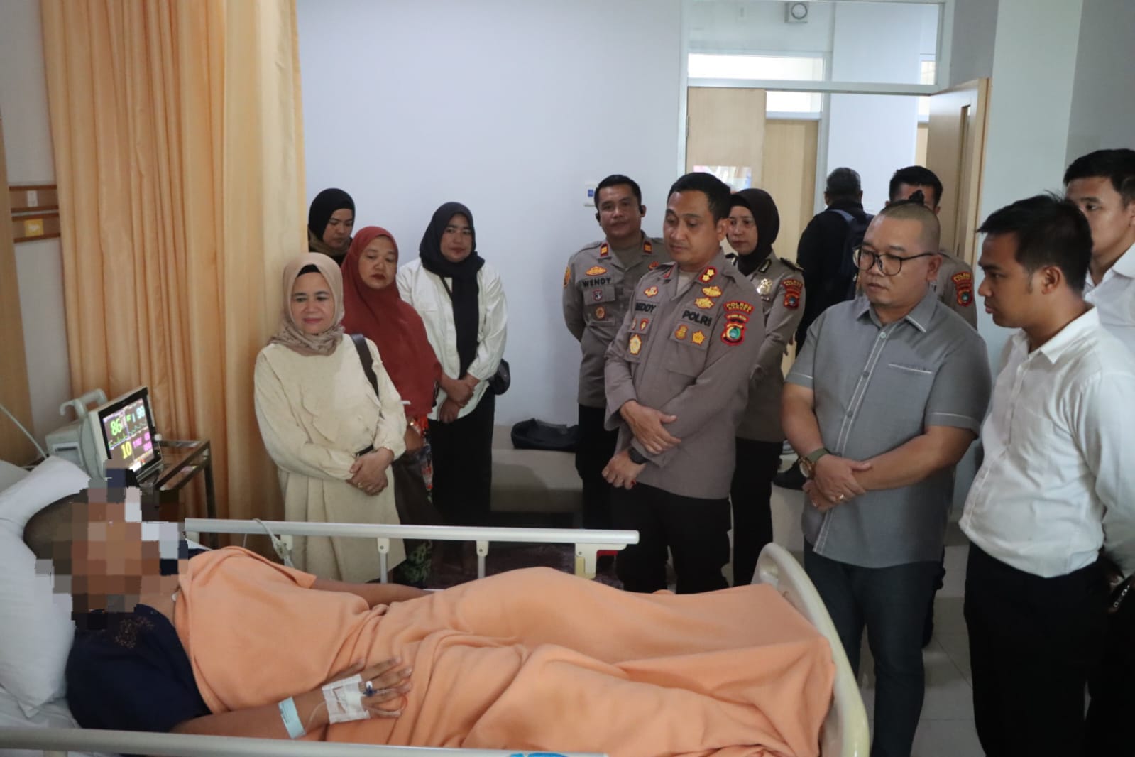 Bertempat di RSU Mitra Medika Pangkalpinang, Dalam kegiatan tersebut, Kapolres didampingi oleh Kasat Reskrim, Kasi Humas, Kapolsek Mendo Barat, serta KBO Reskrim. Kunjungan ini dilakukan untuk memberikan dukungan moril kepada korban sekaligus memastikan penanganan kasus berjalan dengan baik.