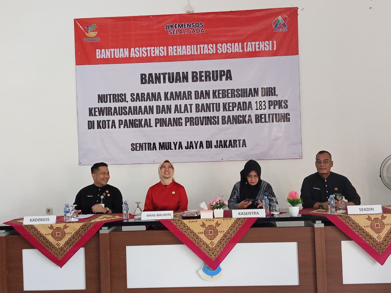 Bantuan ATENSI yang diberikan berupa nutrisi, sarana kamar, kebersihan diri, kewirausahaan dan alat bantu kepada 183 PPKS, selain itu selain Wakil Wali Kota Pangkal Pinang, hadir pula Kepala Sentra Mulya Jaya Jakarta Siti Indiriasari Oktaviana dan juga Sekdin telah turun langsung ke lapangan untuk menyalurkan bantuan sehingga tepat sasaran.